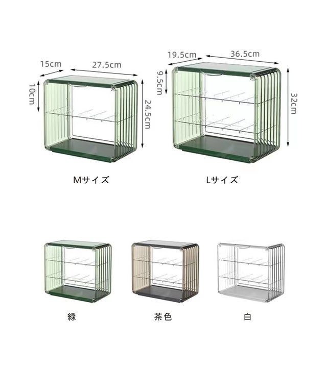 例えば、Mサイズは横の長さが27.5cm、奥行きが15cm、高さが24.5cmになり、小さいフィギュア(縦横5cm高さ9cm程度)をたくさんお持ちの方でしたら3列くらい並べることができます。仕切り板を使用し上下段合わせて約30体ぐらい収納することができます。Lサイズは、横の長さが36.5cm、奥行きが19.5cm、高さ32cmになり、同じく小さいフィギュアでしたら、3列~4列ほど並べることができ、上中下段を合わせて約50体~60体ぐらいを収納することができます。大小様々な形があるかと思いますので、お好きに並べてみてください。ごちゃごちゃさせたくない方でしたら、シンプルに1列に飾ってみるのもおすすめです。