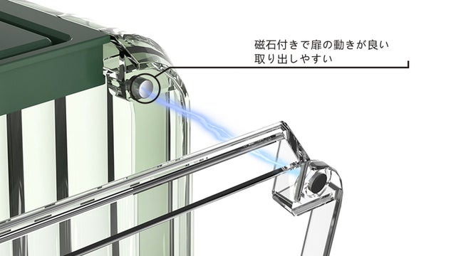 - 前扉は大きな角度で開閉でき、左右の角に磁石が付いているから物を取り出しやすい!