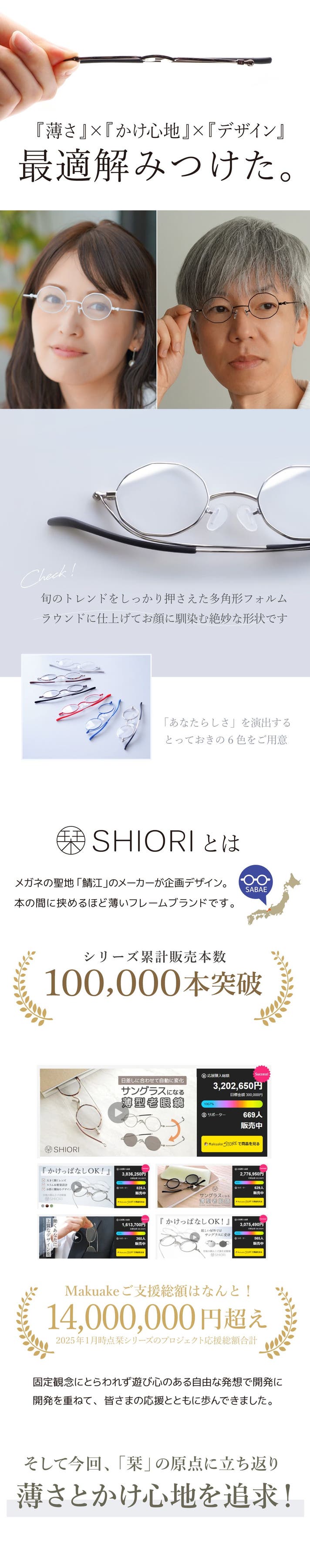 「Makuake(マクアケ)」は、実行者の想いを応援購入によって実現するアタラシイものやサービスのプラットフォームです。このページは、 プロダクトカテゴリの 「【鯖江発】持ち運び簡単&お顔にジャストフィット!楽すぎる薄型老眼鏡「栞」」プロジェクト詳細ページです。