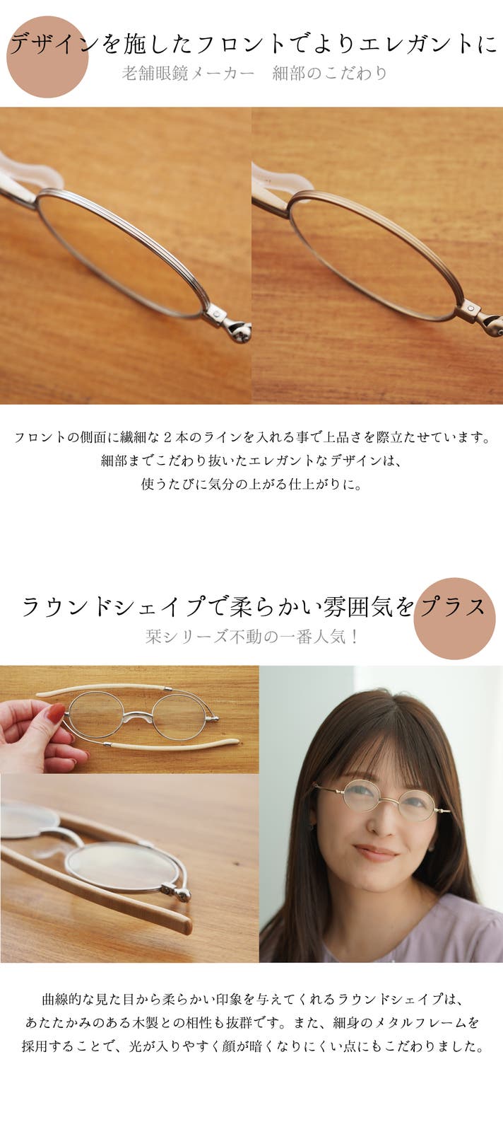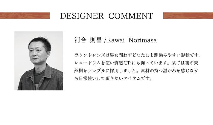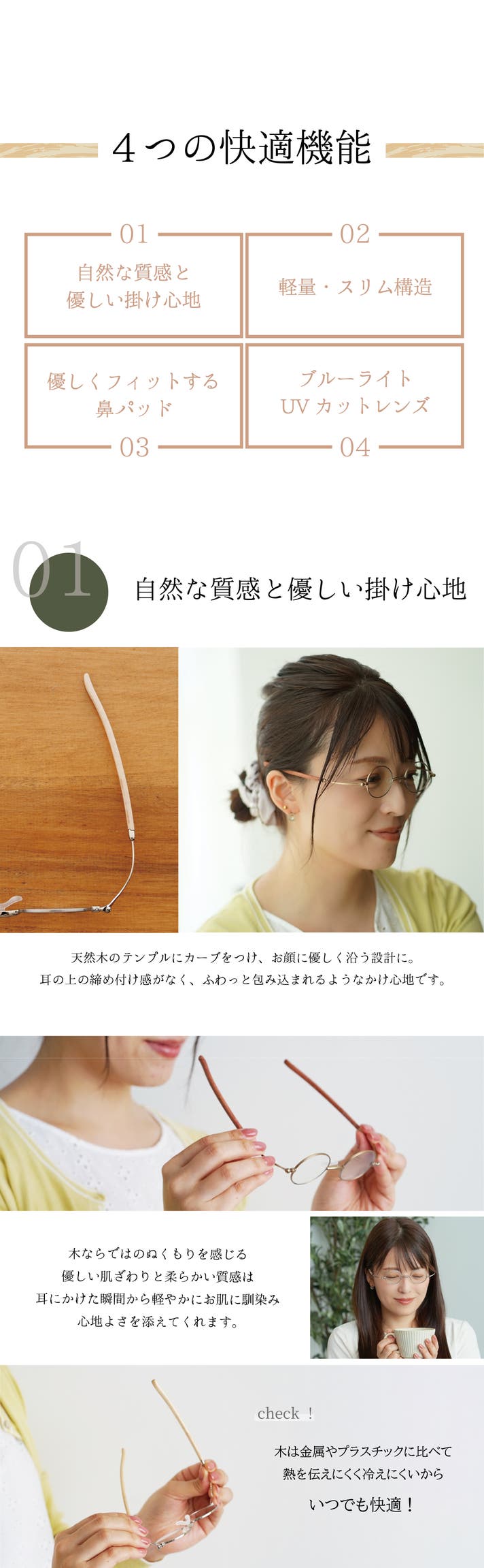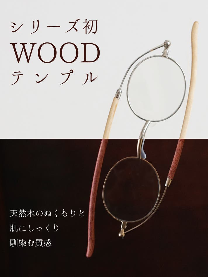 - あたたかみのある天然木のテンプル。優しい肌あたりと柔らかい雰囲気で包み込むような快適さ。