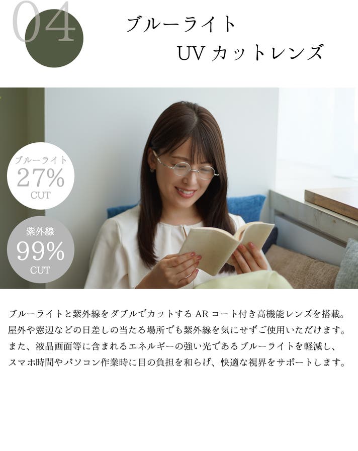 - グリップ力のある鼻パッド・ブルーライト27%、UV99.9%カットの高機能素材を使用。