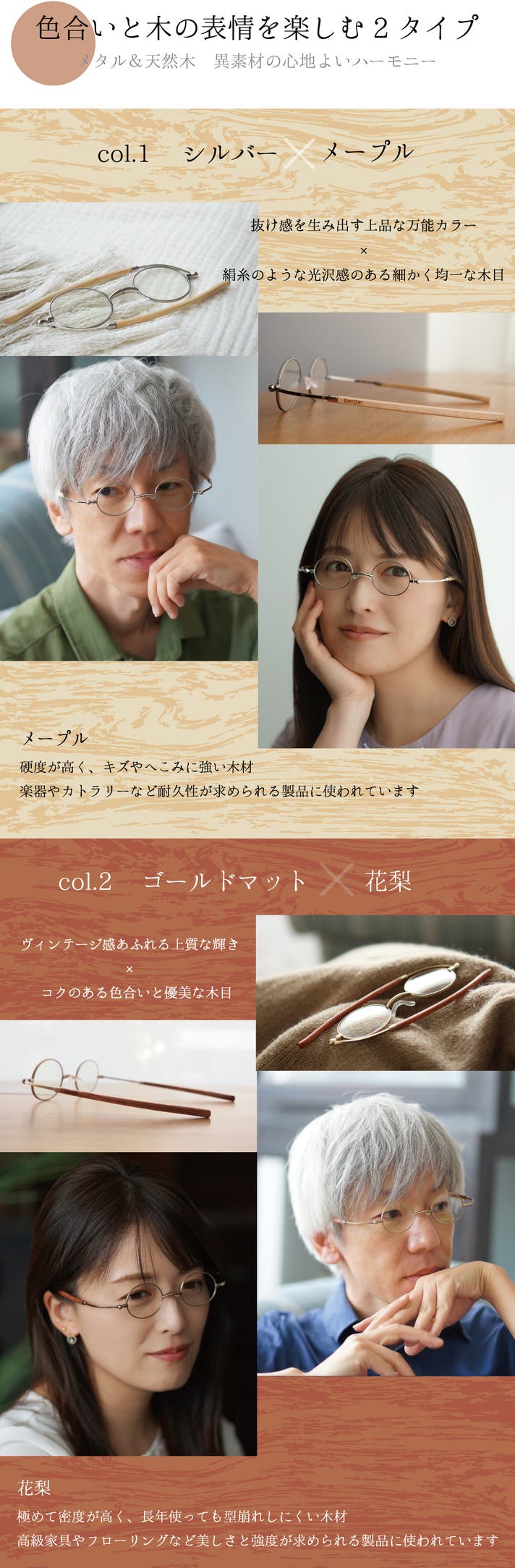 使い込むごとに深みが増していく天然木のテンプルと上品なメタル素材の融合は、置いてある姿も美しく、長く楽しめるアイテムに仕上げました。