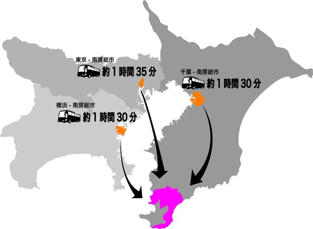 都心部からの道のりが格段に短くなり、近年高速バスの本数と利用客数が増加しており東京•横浜から2時間程度、千葉からは1時間半程度で訪れることができます。