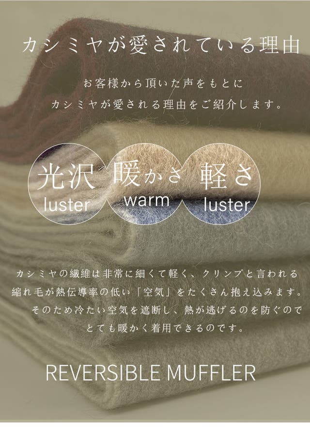 シルクのような光沢感が魅力のカシミヤリバーシブルマフラー。長くご使用されることで空気を含んで柔らかくなり、ふっくらと厚みが出て、肌触りも良くなります。