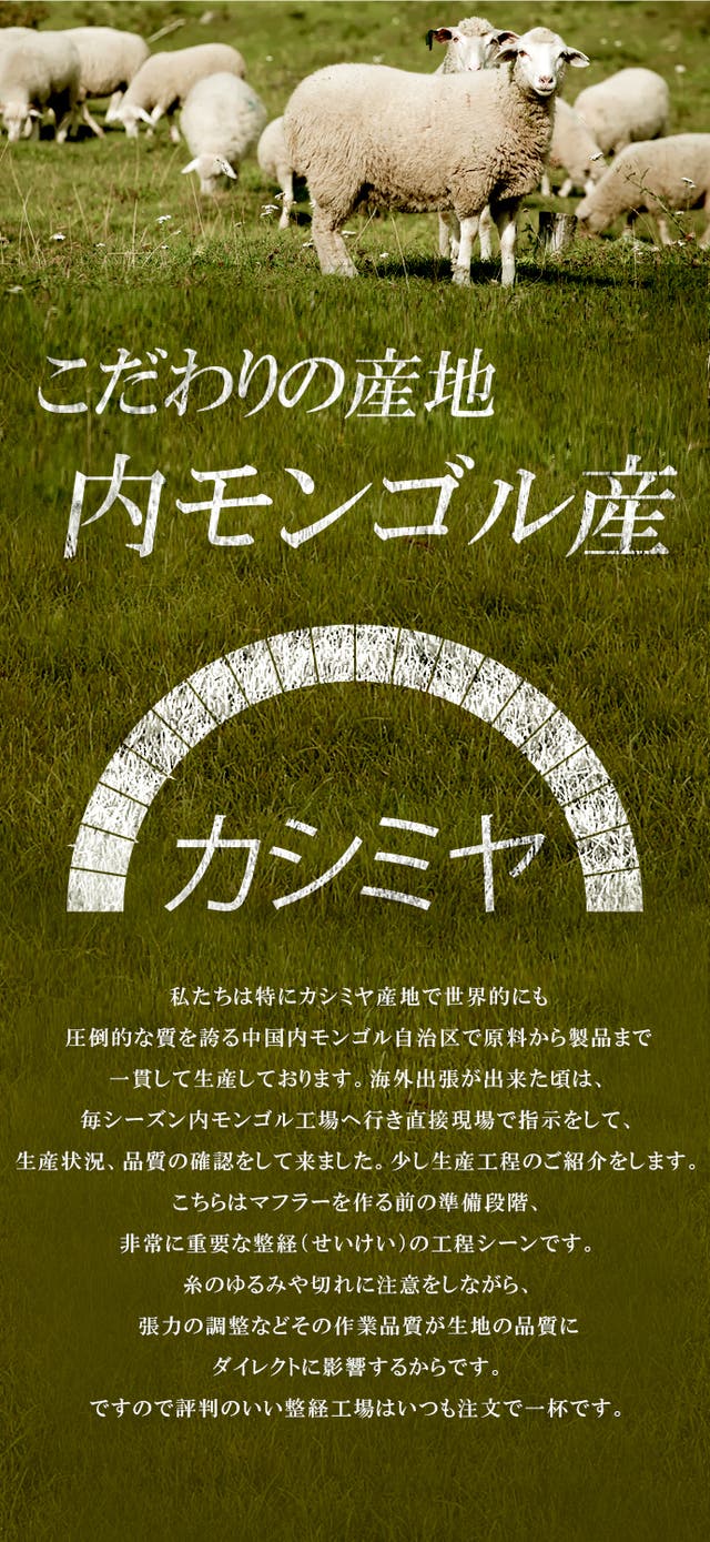 - 世界有数のカシミヤ産地(内モンゴル)のカシミヤとベビーウールで柔らかさ、軽さ、保温性を実現!