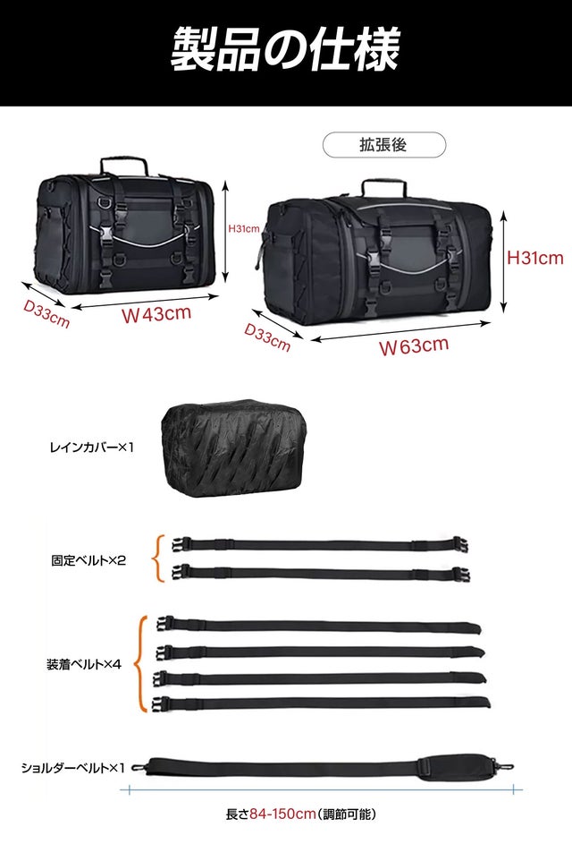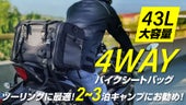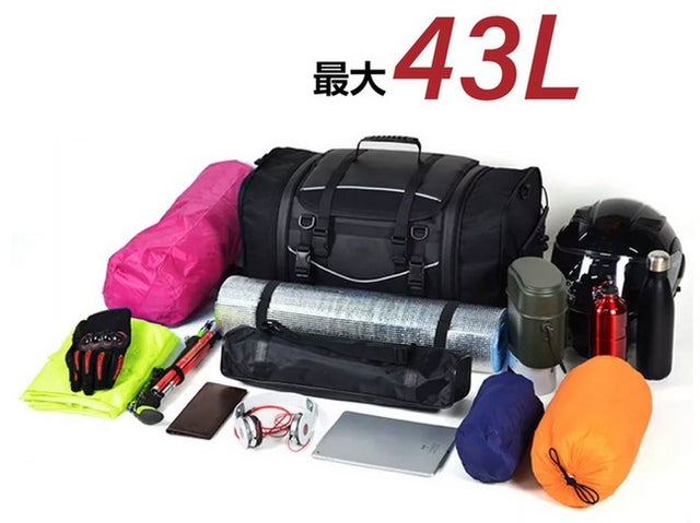「バイクシートバッグひとつでキャンプツーリング2~3泊に行ける女性ライダーにも使いやすい!」という企画開発コンセプトを実現するためにバッグ容量を小さすぎず、大きすぎず30L~43Lに設定。シュラフ、ツーリングテント、コッヘル、着替えをしっかり収納することができます。レインカバー付き、サイドポケット、サイドポケットゴムを自分好みに変えられるシートバッグを旅の相棒にお勧めします!