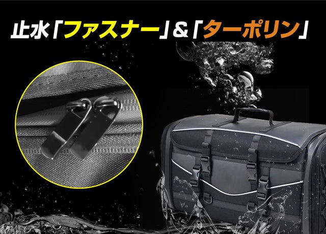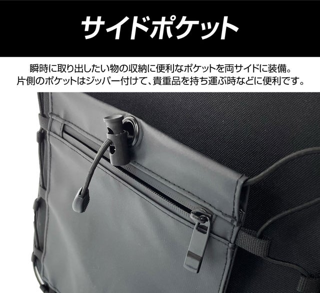 トップカバー、フロント、バッグサイド、にターポリンと水に強い加工した高密度1200Dポリの組み合わせ、サイドポケットはターポリン。ファスナーからの浸水を防ぐ止水ファスナー仕様です。私が持っていたバッグは通常普通のファスナーでそこから浸水し中がびしょ濡れの経験がありました。意外と止水ファスナーを採用しているシートバッグは少なく感じていました。
