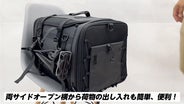 両サイドオープンしストラップで固定。横から荷物の出し入れも簡単、分かりやすい。