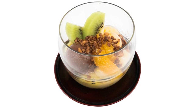 濃厚カカオ70%から作ったチョコペーストとオレンジジュレのマリアージュ、柔らかな白玉にはオレンジピールを練り込み、トッピングのくるみのキャラメリゼで食感をプラス、チョコ好きに好評に商品