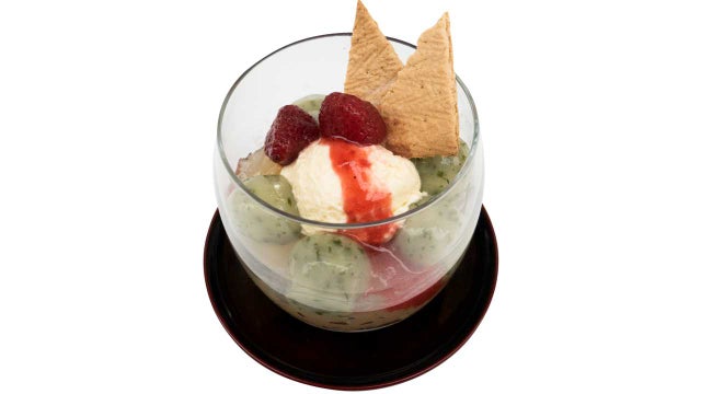 バジルを練りこんだ白玉には木苺のソースとライチのジュレで、チーズムースとグラハムクッキーを入れてアクセントにしている“しらたまや”の目玉商品をリニューアル