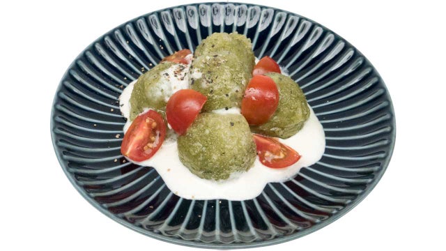 バジルを練りこんだ揚げ白玉にクリームとトマトのソース、アクセントにブラックペッパーを効かせた“しらたまや”特製バジルメニュー