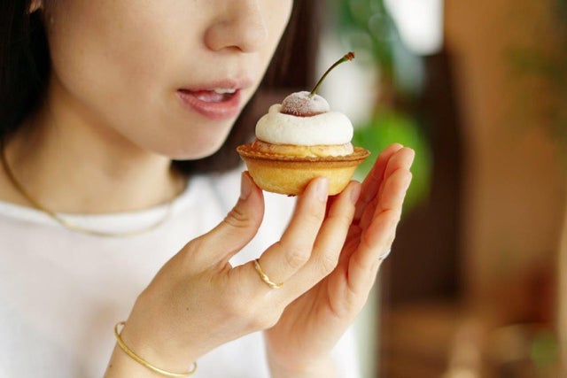 チーズタルトを片手に、2層の重なりを一口でパクっ!と