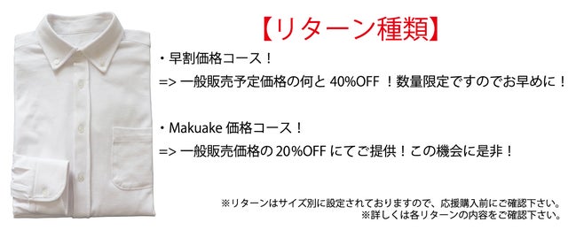 もちろん、この白シャツを応援購入品としてご用意させて頂きます。Makuakeだからこそお得にご購入頂けるのはもちろん、更にお得な早割コースもご用意しておりますので、是非ご検討下さい。
