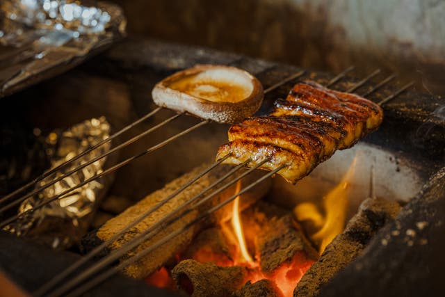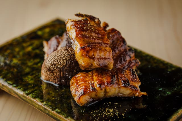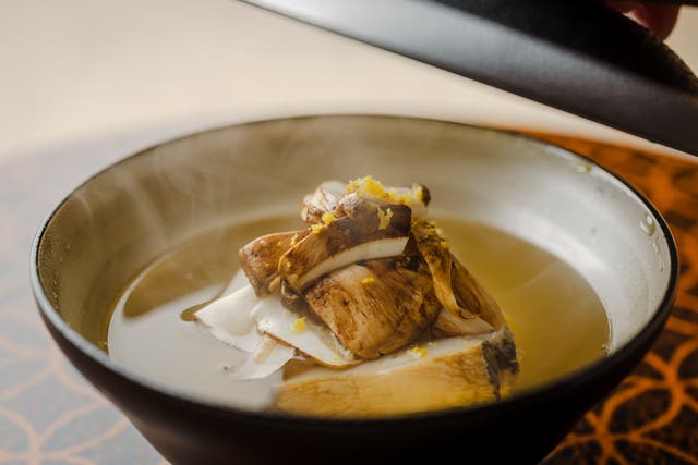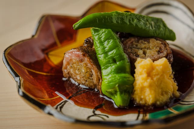 脂の甘味が絶妙なサーロインで、シャキシャキとした歯応えが特徴の琥珀茸をロール。黄身と合わせた大根おろしでさっぱりとお召し上がりください。