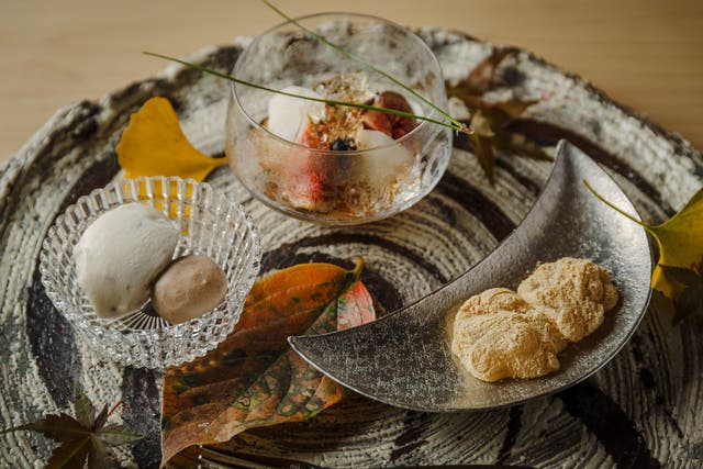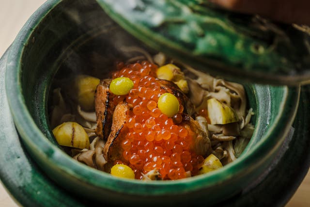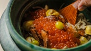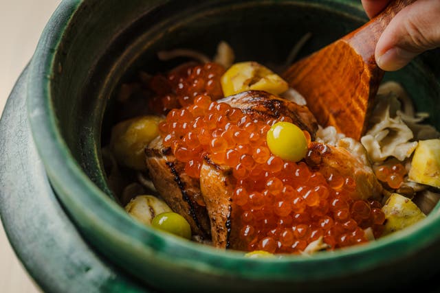 舞茸と鮭いくらのご飯では、庄内米を使い、ふっくらと炊き上げます。きのこと魚介、それぞれの秋の味覚を贅沢に使用しています。