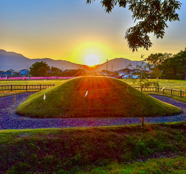 糸島の平原王墓は、弥生時代の王墓で女王が埋葬されていたことが発掘調査や副葬品等からわかっています。また、その王墓の作りは、10月20日に、日向峠より差し込む朝日(太陽光)が女王の身体に差し込み、八咫鏡を通じて太陽と一体となるという作りになっています。ここ平原の地は、太陽の神殿…つまり太陽信仰の始まりを証明するものとなっています。