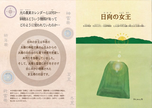日向の女王は平原の太陽の神殿で東の山並みからの太陽の日の出の位置で時節を把握し米作りを指導していました。そして、太陽と雷雲に祈りをささげ日に向かい埋葬された女王様のお話です。