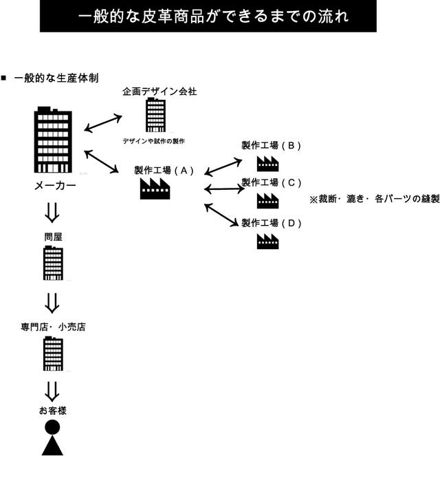 一般的には、デザインを考えるデザイナーからメーカーに依頼。メーカーから試作職人・型紙製作・裁断・漉加工・最終的に製品を縫製する皮革職人と、1つの製品が完成するまでには、何人もの職人さんたちを経て商品となる皮革商品。