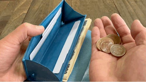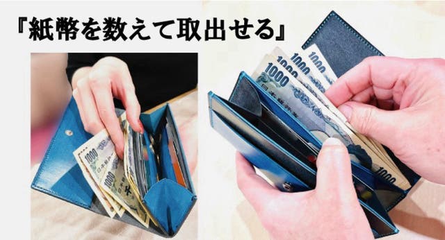 お財布からお札を取り出す前に枚数を数えることができ必要枚数を「ワンアクション」で取出すことが可能です。今までのお財布では、お財布の中の紙幣を指先で探り必要な枚数を引出してお支払い。「2アクション」の動作になってしまいます。