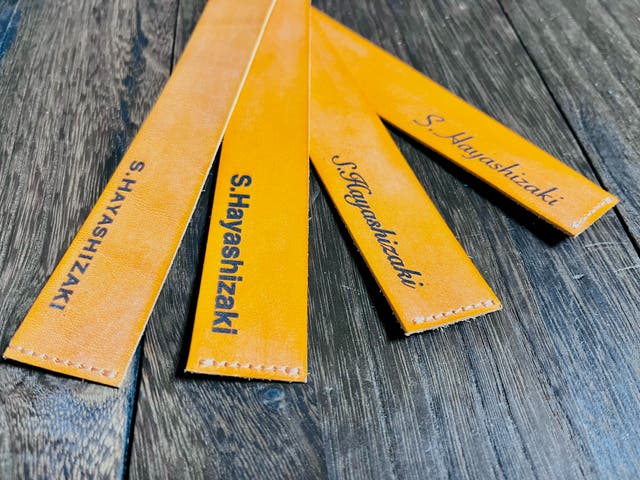 ※私の個人名を約5cm幅でレーザー彫刻名入れした画像です。ベジタブルタンニン鞣しのヌメ革だからこそ、曲線が多いアルファベット筆記体でもエッヂの効いた名入れに仕上がっております。