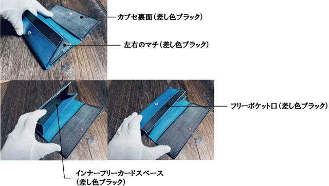 ご注文時、7色からお好きなカラーを2色をお選び頂けます。お財布表面全体の「メインカラー」と「差し色」をそれぞれご指定下さい。