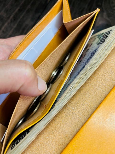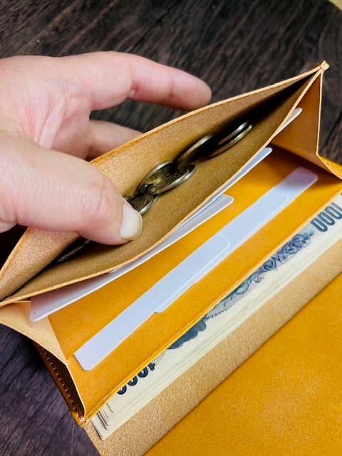 ■コイン収納ポケットが3個所のうち内装センターポケットにもコインが収納可能なスペースになっています。一度にザクっと収めたいときにお使いになれます。