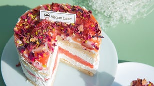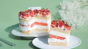 国産のスイカと国産のバラ、国産の苺を使ったヴィーガンかつグルテンフリーのケーキです。