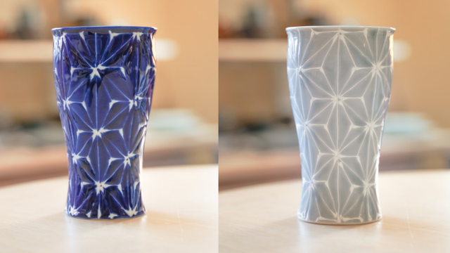 線と点が織りなす繊細なデザインをベースにし、清涼感・透明感のある切子にも似た風合い。釉薬ならではの陰影のある独特な深みがプレミアムな時間を演出します。