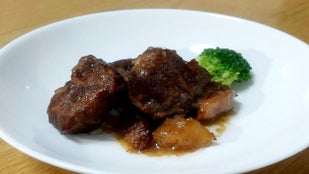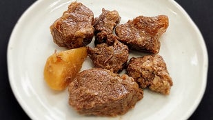 原材料名:牛肉(国産)、じゃがいも、醤油、みりん、砂糖、赤ワイン、リンゴ、カツオコンブダシ、にんにく、からし、コショウ/調味料(アミノ酸等)、酸味料、酸化防止剤(亜硫酸塩)、(一部に牛肉・小麦・大豆・リンゴを含む)