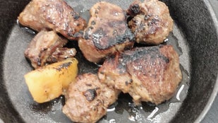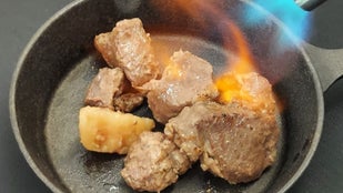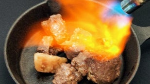 豪快に鉄製のスキレットの上からガスバーナーで炙り焼きにしています。