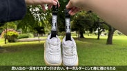 スニーカーを加工する事なくアダプターを挿入するだけでストラップアクセサリーとして利用ができる。
