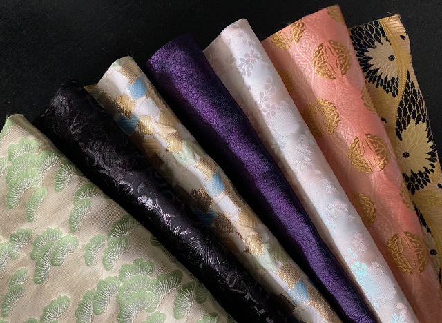 数千を超える素晴らしい金襴織物の中から、描かれた伝統柄の意味と筆文字との調和を考慮し、厳選の7枚をお選びしました
