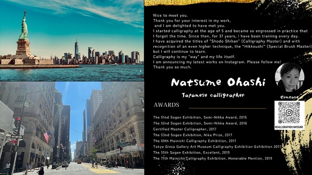 ⬜︎筆耕会社を営む叔父が、高齢の為に廃業との意向で事業を継ぐ決心。書家としても独立し念願のアメリカニューヨークにて展示会。現地ニューヨーカーに大変な好評をいただく