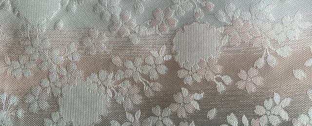 淡い色合いでありながらも虹色の光を放つ大変美しい生地です。桜文様は、平安時代から梅に変わって春を代表する花となりました。春にはたくさんの花が芽吹き、花の象徴でもある桜は『縁起の良い物事の始まり』を意味するとされています。多くの和柄にも使われ、今や日本だけではなく世界中の人々をも魅了しています。まさに日本になくてはならない花です。