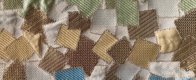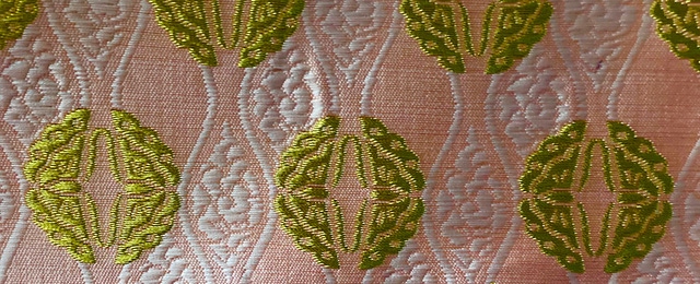綾織(あやおり)・琥珀織(こはくおり)・繻子織(しゅすおり)などの布地組織に、紙に金箔を貼り細長く切った平金糸(ひらきんし)、糸に金箔を巻き付けた撚金糸(ねんきんし)を緯糸(よこいと)に織り込み、金糸や色糸で模様を顕した古来中国に起源を持つ伝統的な紋織物の一種。元々は正絹糸や綿糸そして本金箔の金糸のみで織られた豪華絢爛な織物でしたが、時代の進化に伴い合繊やアルミ金糸を使い時代のニーズに合った金襴が織られ、現代では金糸を使わない無金物(むきんもの)と呼ばれる詫び寂びを出した織物も含めて金襴と呼んでいます。(荻野金襴織物株式会社さんHPより抜粋)