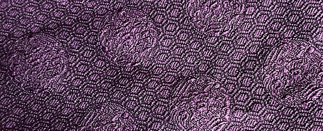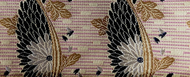 向い蝶とは、二羽の蝶を向かい合わせにしてデザイン化した柄です。平安時代から十二単の唐衣(一番上に着る衣の名称)などに多く用いられ、現代でも礼装用の着物、帯、家紋にもなっています。立湧文は蒸気がゆらゆら立ち昇っていく様を表現した『運気を上げる文様』、更に幸運の予兆として昔から縁起がいいものとされきた瑞雲も織り込むことで『運気上昇・幸運』などの吉祥文様とされます。高貴な色彩がひときわ美しい織物です。