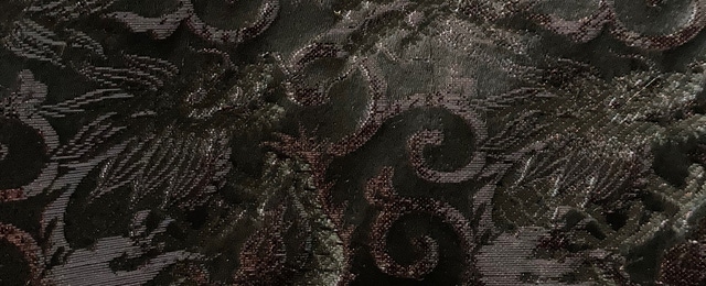 鳳凰(ホウオウ)は中国の神話に由来する伝説の鳥をモチーフとし、西洋では、東洋の不死鳥(フェニックス)と呼ばれます。天下泰平の世にのみ姿を現わすとされ『平和と金運、幸せをもたらす伝説の鳥』とされています。亀甲紋とは亀の甲羅の形(六角形)を連続させた幾何学文様で、亀は万年生きることから『長寿の象徴』縁起の良い柄です。亀甲紋を全面に織り込み地紋とし、瑞鳥である鳳凰を同色の横糸で織り込み、華やかさの中にシックな雰囲気感じる金襴織物です。
