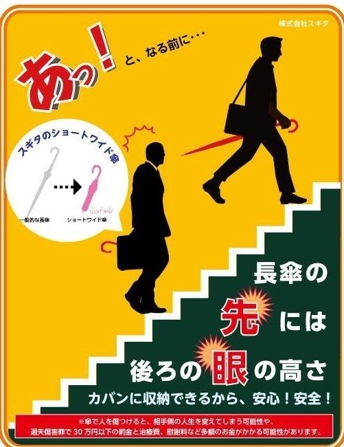 その持ち方の傘の先端は、子供の目の高さだったり、階段やエスカレーターでの後ろの方の身体に接触する事故が頻発しております。