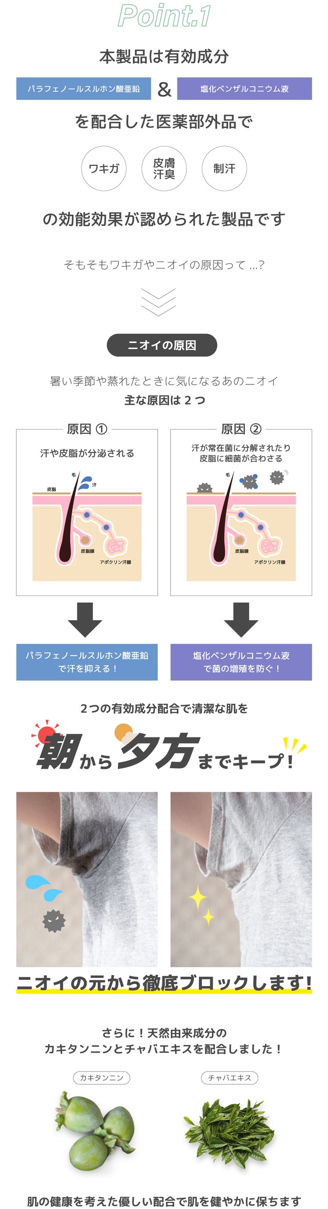- ワキガ・制汗・皮膚汗臭の効能効果が認められた医薬部外品!