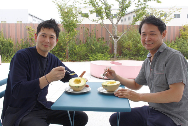 今回この企画のために、松本&江森コンビにはクラウンメロン支所の支所長である中條文義のハウスを見学して頂き、日々真剣に心を込めて、色々な技術や特徴を踏まえてメロンを育てている中條の想いや熱意を伺う機会を作ることが出来ました。