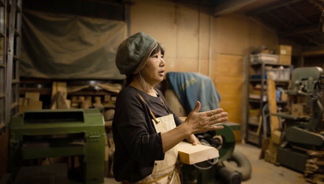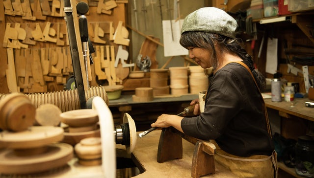 菊池奈美さんは、エコロジーの観点から使用する木材を厳選されており、地元の森林の間伐材や、ご自身で剪伐された木材のみを使って木工作品を制作されています。木に感謝の気持ちを込めて一つひとつ手作りする菊池さんの作品にはどれもほっこりとした温かみがあります。
