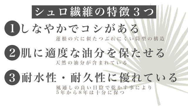 本製品の素材である「棕櫚(シュロ)」は、ヤシ科の植物です。
