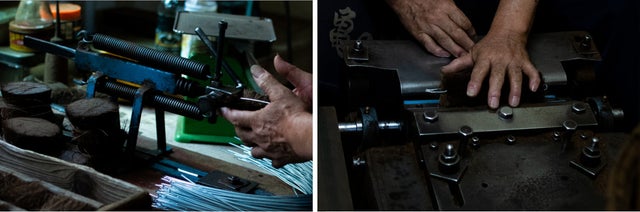 シュロたわし工房「サガラ」では特注品の専用機械を使用してたわしを製造しています。たわし製造に必要な機械は先代から何十年も職人と一緒に生きてきた世界に一つしかない特別な機械です。