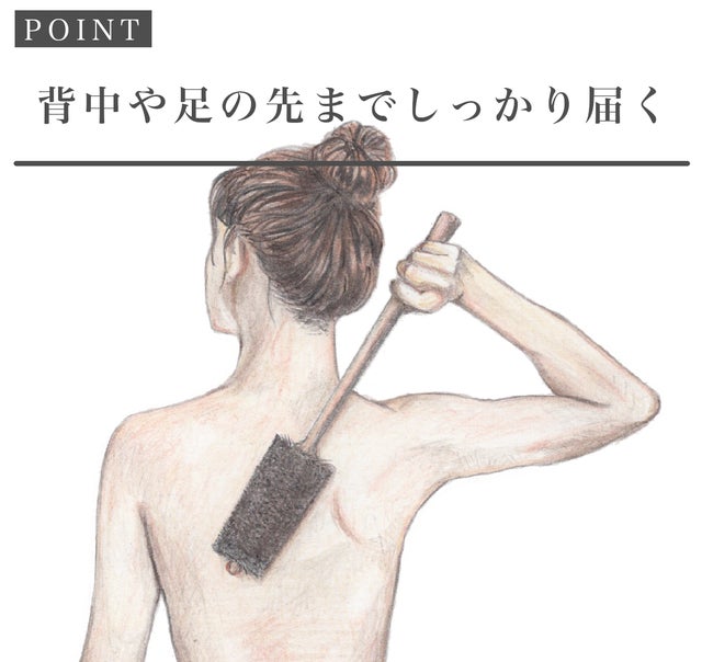 全身に届く長さに仕上げ、バスチェアーに座ったままで、足の先まで身体の汚れをさっと落とせます。背中のケアにも最適です。四十肩・五十肩の方や、高齢の方にも強い味方です。