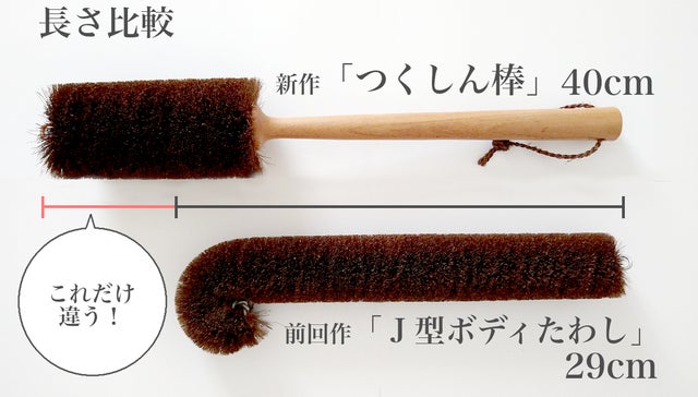 好評をいただいた前回作「J型ボディたわし」に続く第二弾「つくしん棒」は、前回とおなじく東京の老舗たわし工房「サガラ」が製造します。