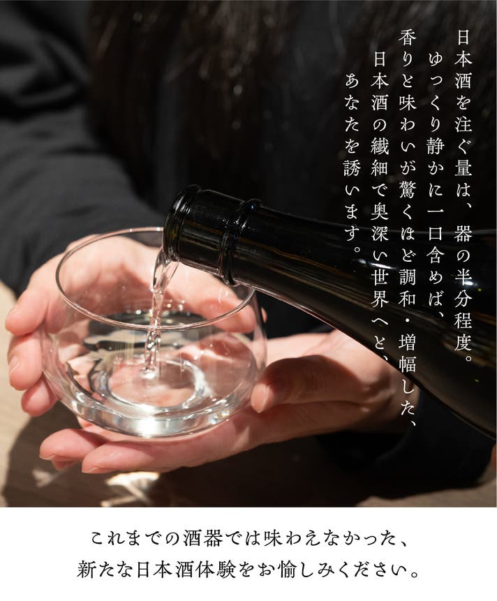 器の半分程度(90cc~120cc)日本酒を注ぎ、飲んでいただくことで、これまでにない新たな日本酒の美味しさを体感いただけます。