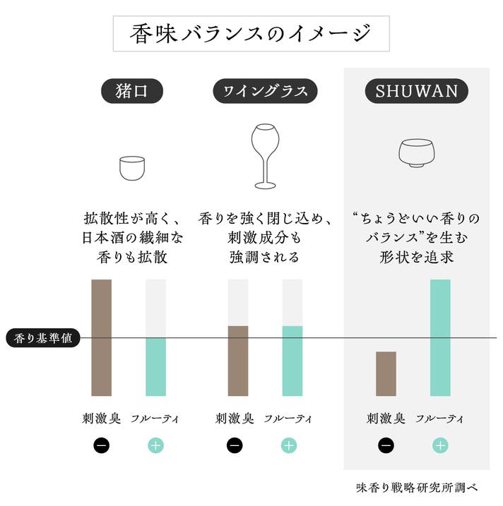 「SHUWAN」は液体を滑らかに口に流す形状になっており、香味のバランスを保ったまま味わいを増幅させるので、専門家が感じている全体像に限りなく近づけることができます。
