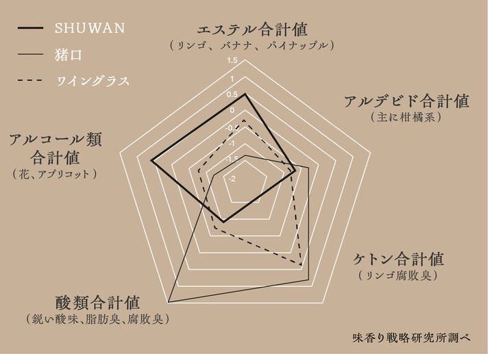 また、様々な形状の酒器による純米吟醸酒のにおいバランスを調べた結果、「SHUWAN」ではリンゴ・バナナといったフルーツ系の成分量が多く、不快な臭い(鋭い酸味や腐敗臭)を形成する成分量が少ない結果に。