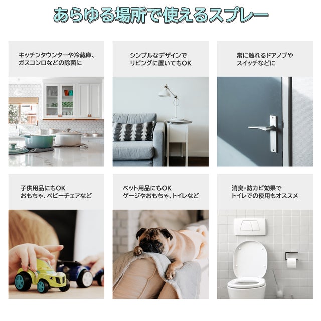 身の回りで触れることが多い場所はもちろん、高微細ミストが繊維の中まで浸透するので衣類にもご使用可能です。