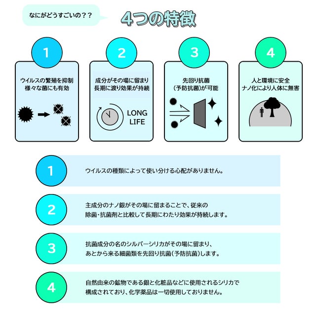 - アルコールフリー!!自然界にある成分のみで構成した抗菌剤「ナノシルバーシリカネオ」